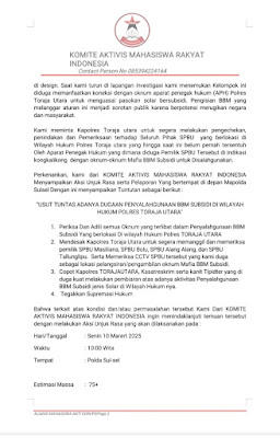 OK-GAS.COM | Toraja Utara, Sulawesi Selatan - Komite Aktivis Mahasiswa Indonesia (KAMI) mengecam dugaan keterlibatan oknum aparat penegak hukum (APH) di Polres Toraja Utara dalam praktik mafia BBM bersubsidi. KAMI mendesak Kapolda dan Kapolri untuk menindak tegas oknum yang terlibat dan mengancam akan melakukan unjuk rasa di depan Polda Sulsel pada Senin, 10 Maret 2025 pukul 15:00.